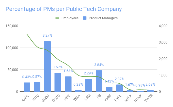 To illustrate, here is a quick analysis based on some publicly-available data from Yahoo! Finance and LinkedIn self-reported job titles. Product manager job titles are only 1.76% of the entire employee population on average. If you’re breaking into product management, you will have to hustle to find an open role and match yourself into it.
