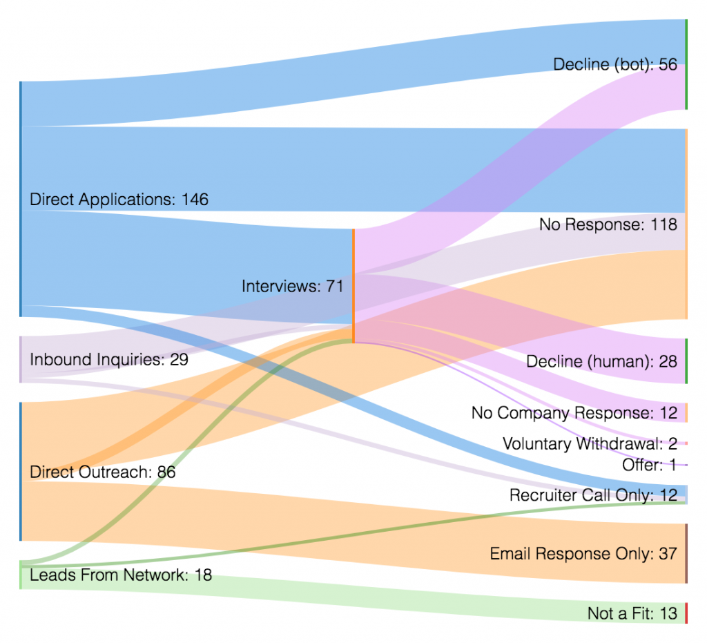 Twelve months is a long time to interview. In that year, I applied to 146 roles, interviewed with 71 companies (times multiple people per company), and drank a lot of coffee. Good PMs are data-driven, so I built a Sankey chart of the search activity that year to visualize the process.